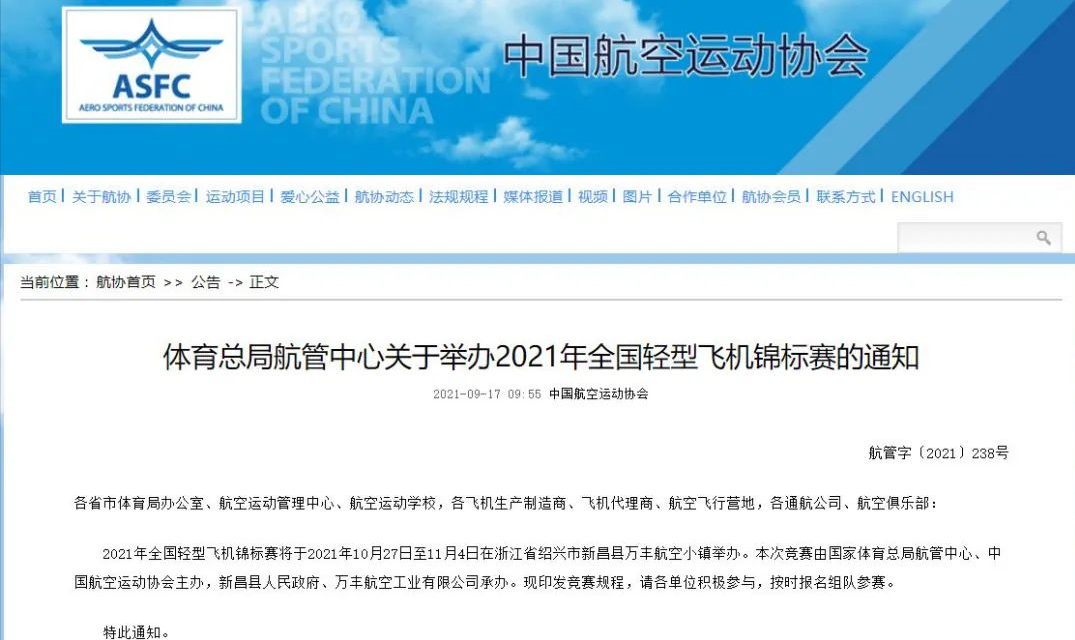 在珠海航展落下帷幕之際,通航界另一場(chǎng)盛事——2021年全國輕型飛機錦標賽即將在萬(wàn)豐航空小鎮開(kāi)啟。全國輕型飛機錦標賽是由國家體育總局航空無(wú)線(xiàn)電模型運動(dòng)管理中心(以下簡(jiǎn)稱(chēng)“體育總局航管中心”)、中國航空運動(dòng)協(xié)會(huì )主辦的國家級輕型飛機賽事,是我國最高水平的飛機運動(dòng)賽事。9月17日,國家體育總局航空無(wú)線(xiàn)電模型運動(dòng)管理中心發(fā)布通知,該通知指出,2021年全國輕型飛機錦標賽將于10月27日至11月4日在萬(wàn)豐航空小鎮舉辦。本次賽事由國家體育總局航管中心、中國航空運動(dòng)協(xié)會(huì )主辦,新昌縣人民政府、萬(wàn)豐航空工業(yè)有限公司承辦。