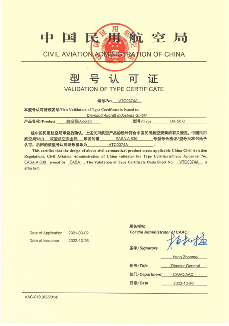 10月26日,萬(wàn)豐鉆石DA50飛機通過(guò)中國民航局全部的技術(shù)驗證,完成中國型號認可證(VTC)取證。