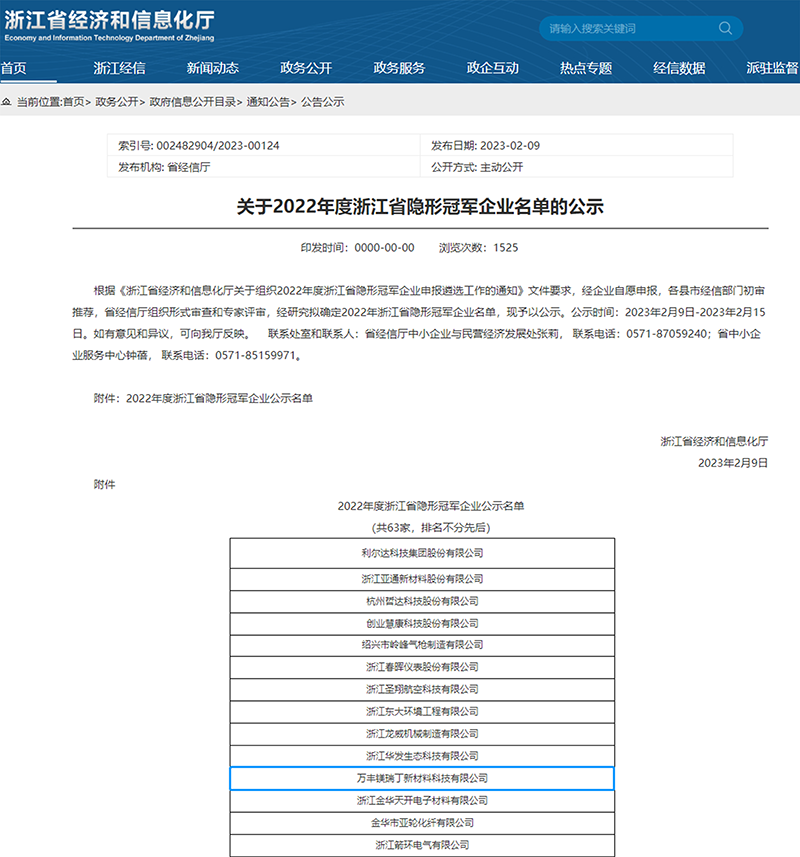 萬(wàn)豐鎂瑞丁獲評2022年度浙江省隱形冠軍企業(yè)